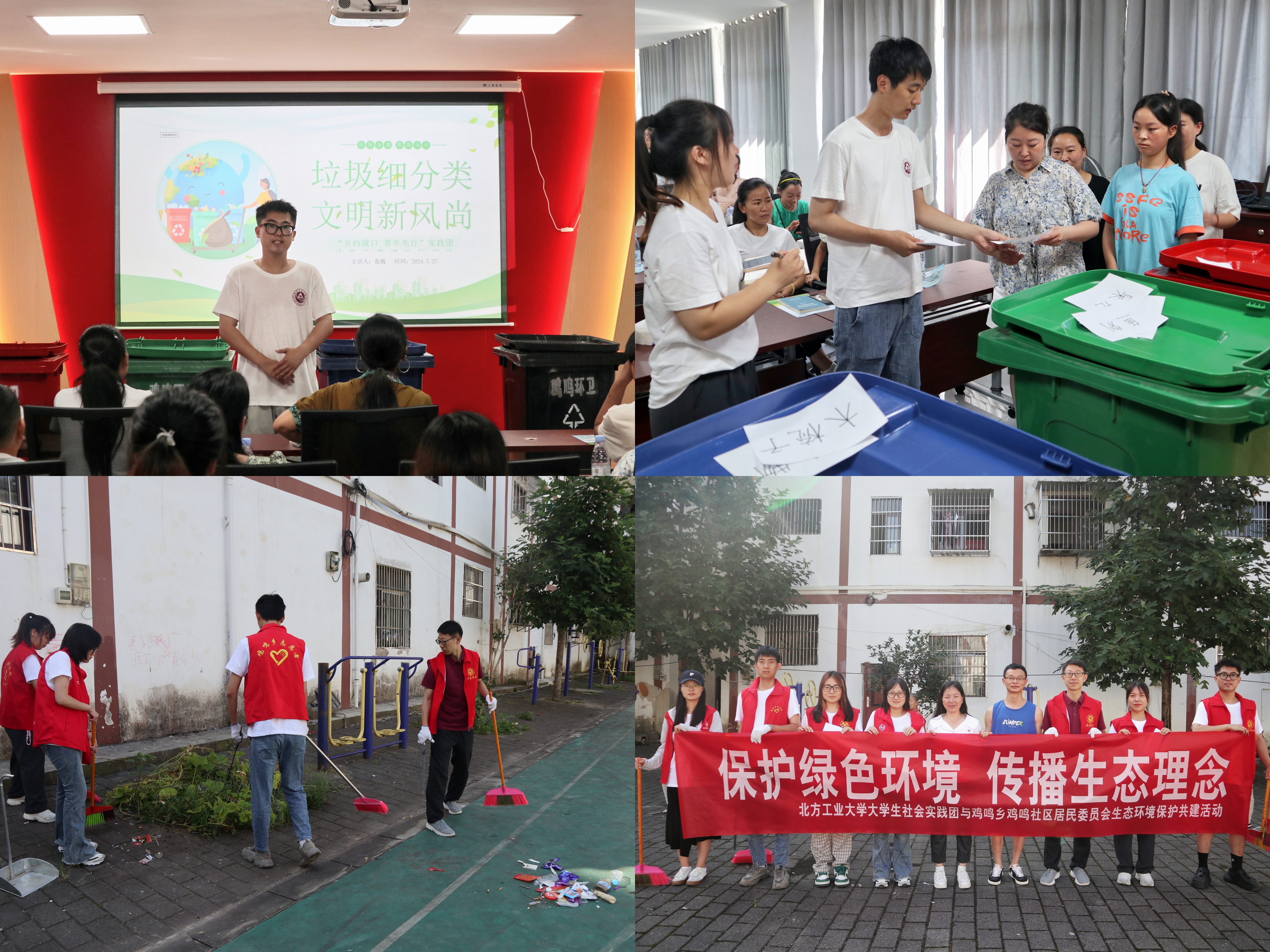 为贯彻落实习近平生态文明思想,传播绿色环保理念,实践团同鸡鸣社区居民委员会共同开展了“垃圾分类进社区”专题系列活动。实践团举办了“垃圾分一分,鸡鸣美十分”垃圾分类知识小课堂,通过真实生动的案例讲解和互动问答,使居民们对垃圾分类和环境保护的意义与方法有了更深入的了解。同时,实践团还组织了寓教于乐的“垃圾分类”趣味游戏活动,居民们参与热情高涨,通过游戏的方式提高了大家的环保意识,也传播了绿色生活理念。活动结束后,实践团与社区工作人员一同对街道垃圾进行了清理,用青春的热情和行动诠释了“共创绿色家园”的美好愿景,为构建和谐社会、推动绿色发展贡献了自己的力量。