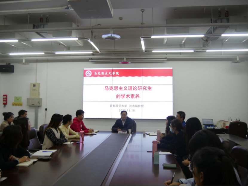 11月18日下午,公司特邀首都师范大学yl7703永利副经理、北京高校中国特色社会主义理论研究协同创新中心(首都师范大学)常务副主任、北京市伦理学会副秘书长、首都师范大学社会文化史研究中心研究员、北京市委讲师团宣讲专家沈永福教授,在瀚学楼1208会议室主讲题为《马克思主义理论研究生的学术素养》的学术报告,公司全体研究生到场聆听,报告由公司副经理张茂林主持。