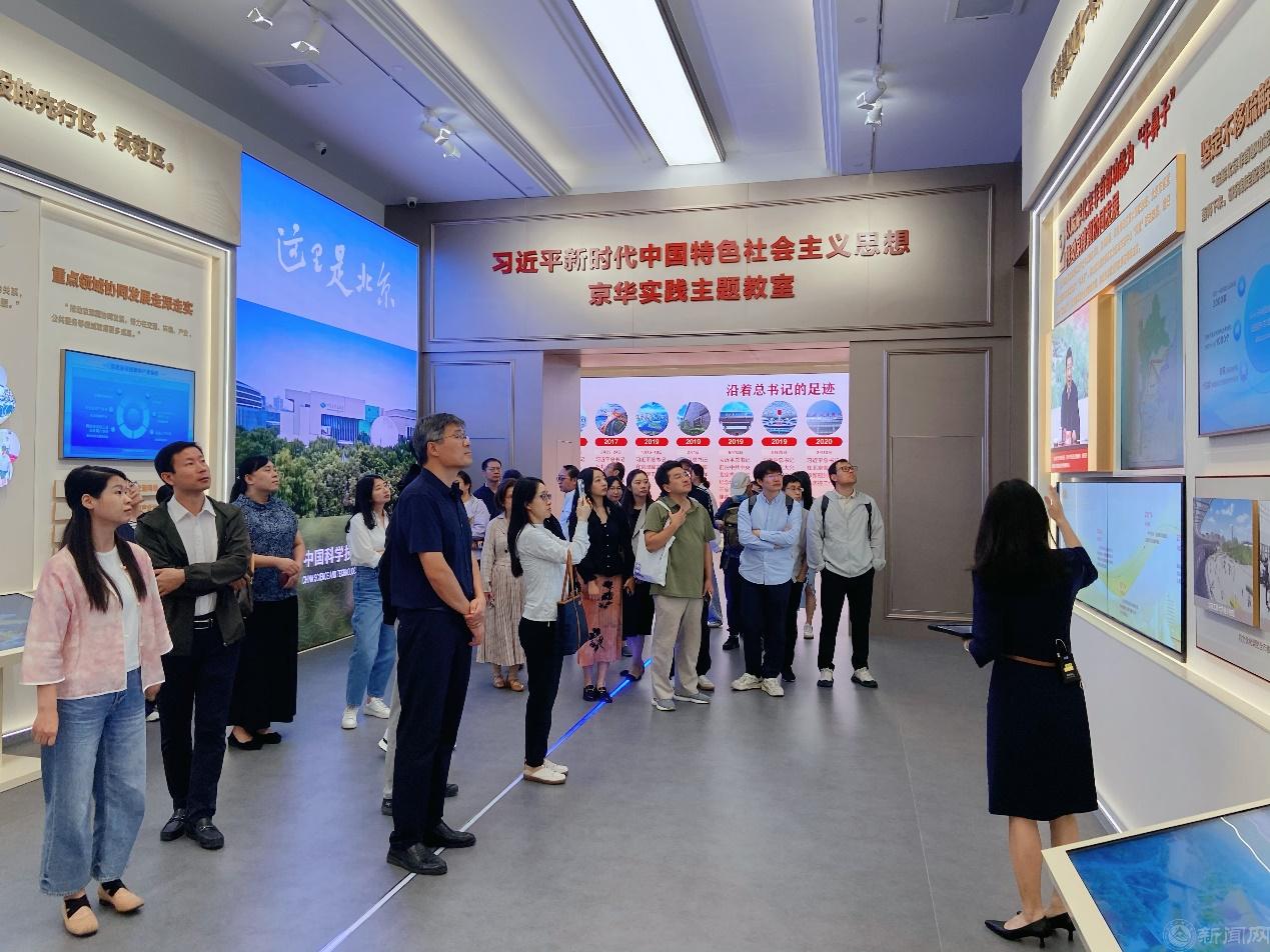 在习近平新时代中国特色社会主义思想京华实践主题教室,教师们通过图文、影像、场景还原等多元载体,系统学习了习近平新时代中国特色社会主义思想在京华大地的生动实践成果。主题教室以“金句+例证+成效”的逻辑展开,以“理论+实践”为主线,全景式展现北京以习近平新时代中国特色社会主义思想为指引,在落实首都功能定位、协同推进京津冀高质量发展、高水平科技创新、全过程人民民主、增进民生福祉等方面的创新举措与显著成效,充分展现了习近平新时代中国特色社会主义思想的强大真理力量和实践伟力,为思政课教学提供了鲜活的“北京案例”。